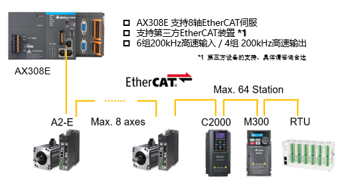 AX3提供标轴版和P2P版,最大到64轴。以台达率先推出的AX308E机种来看,CPU内置有16个DI和8个DO,EtherCAT实时通讯的特性让主机能快速进行更新响应;支持8 轴运动控制,最小同步时间可达1 ms;内置2组增量型编码器以及1组绝对值编码器,以保证运动控制的精度满足需要;系统经台达优化后,可快速识别多个品牌EtherCAT从站的连线信息,实现高度整合。
