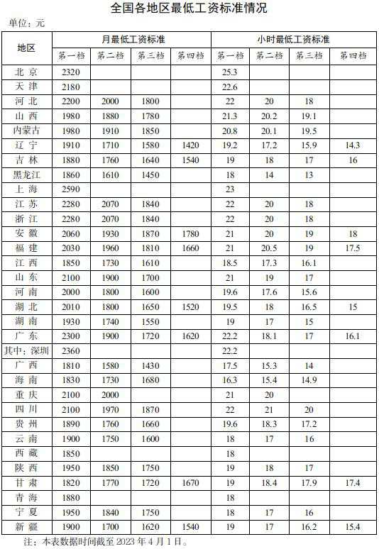 人社部网站近日发布了全国各地区最低工资标准情况(截至2023年4月1日),15个地区月最低工资标准在2000元及以上。其中,上海以2590元仍居榜首。