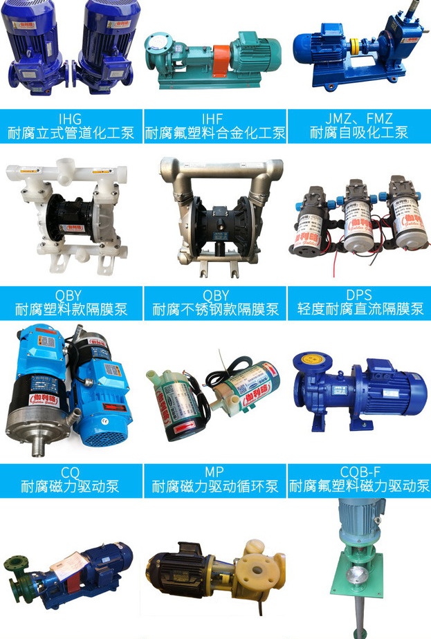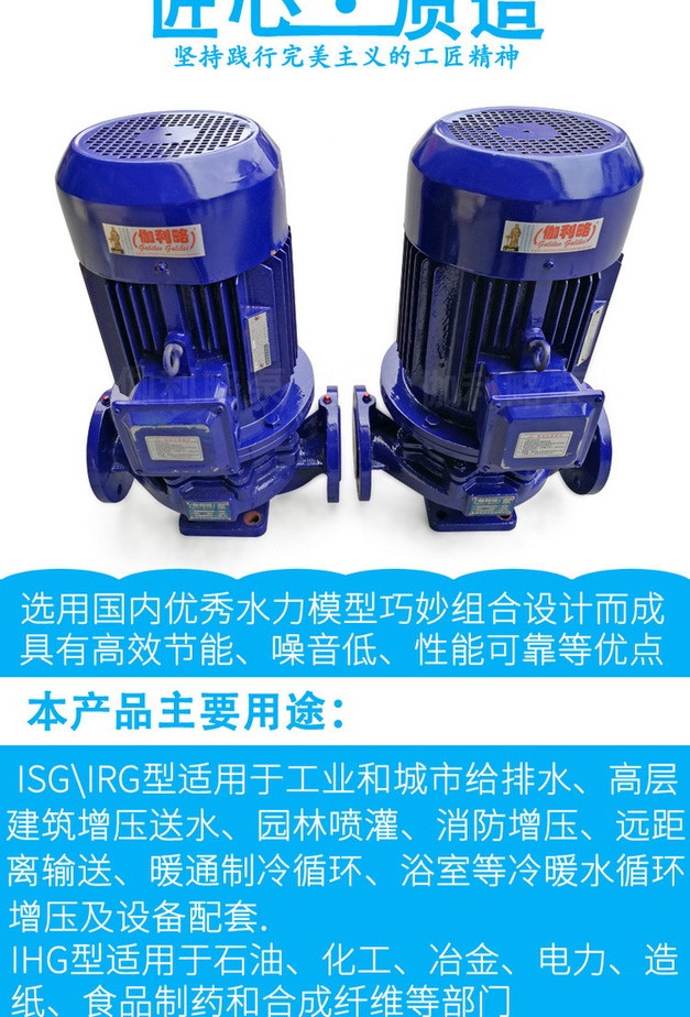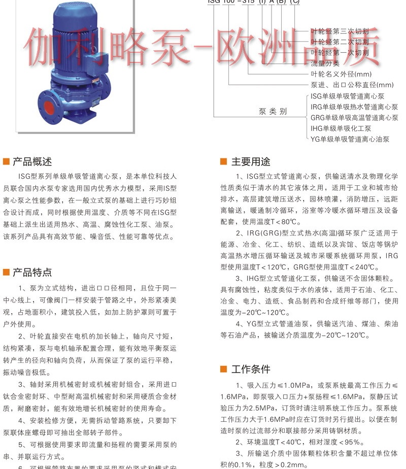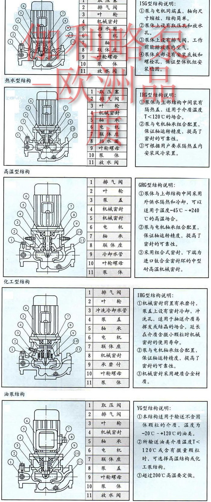 1. ISG立式离心式管道泵,供输送清水及物理化学性质类似于清水的其他液体之用,适用于工业和城市给排水、高层建筑增压送水、园林喷灌、消防增压、远距离输送、暖通制冷循环、浴室等冷暖水循环增压及设备配套,使用温度T<80℃。 2. IRG型立式热水管道泵适用于冶金、化工、纺织、木材加工、造纸以及饭店、浴室、宾馆等锅炉高温热水增压循环输送以及城市住房采暖循环用泵,使用温度120℃以下。 3. GRG型立式高温管道泵广泛用于:能源、冶金、化工、纺织、造纸以及饭店、浴室、宾馆等锅炉高温热水增压循环输送以及城市住房采暖循环用泵,使用温度240℃以下。 4. IHG型立式不锈钢离心式管道泵,供输送不含固体颗粒,具有腐蚀性,粘度类似于水的液体,适用于石油、化工、冶金、电力、造纸、食品制药和合成纤维等部门,使用温度为-20℃ ~ 120℃。 5. YG型管道油泵,供输送汽油、油、柴油等石油产品,被输送介质温度为-20℃ ~ + 120℃。 6. IHGB型立式不锈钢防爆型化工管道泵,适用于输送易燃性化工液体。 7. ISGD、IRGD、GRGD、IHGH、YGD、IHGBD型立式低转速管道泵,适用于环境噪声要求很低的场合及空调循环等。