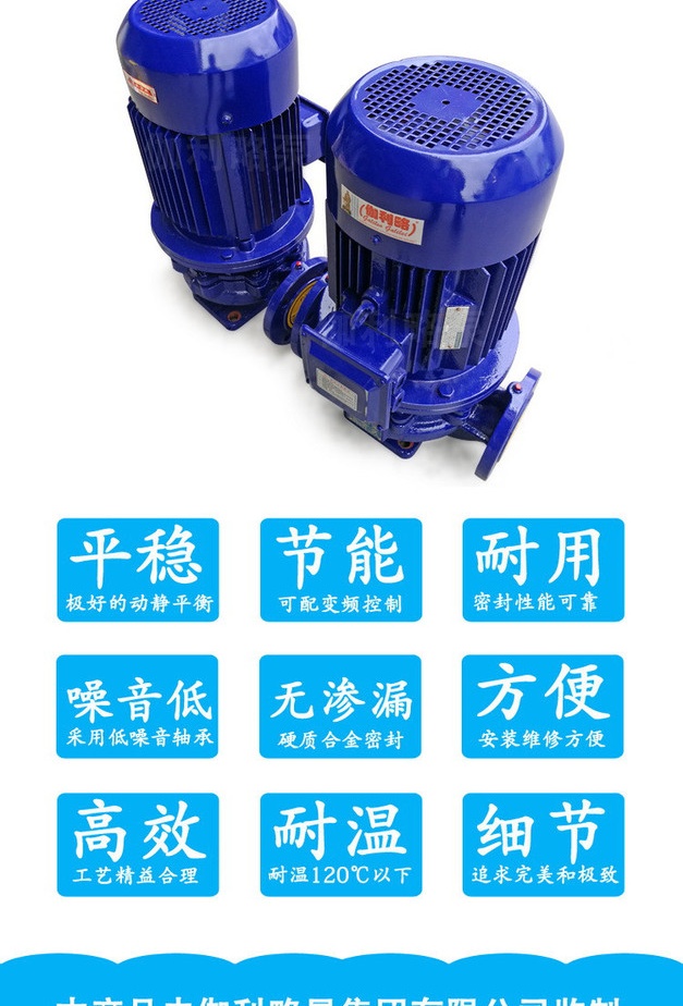 l、泵结构紧凑、体积小、外形美观。其立式结构重心较低且重心合于泵脚中心,增强了泵的运行稳定性和寿命。 2、安装方便。进出口径相同并在同一中心线上,可像阀门一样直接安装在管路任何部位。电机加上防雨罩可置于户外使用。泵设有安装底脚,以便泵的安装稳定: 3、运行平稳、噪音低、组件同心度高。电机采用低噪音轴承,并设有不停机加油装置,泵叶轮具有好的动静平衡,运行无振动,改善使用环境。 4、无渗漏。轴封采用耐腐耐磨硬质合金机械密封,解决了离心泵填料严重渗漏问题,延长了使用寿命,确保了运行场地干净整洁: 5、维修方便。勿需拆卸管道,只要拆下泵盖螺母,取出电机及传动组件即可进行检修维护。 6、可根据现场使用条件,泵机可立式、卧式、多方式安装,依据流量扬程要求,采用并、串联方法,增加所需流量扬程。
