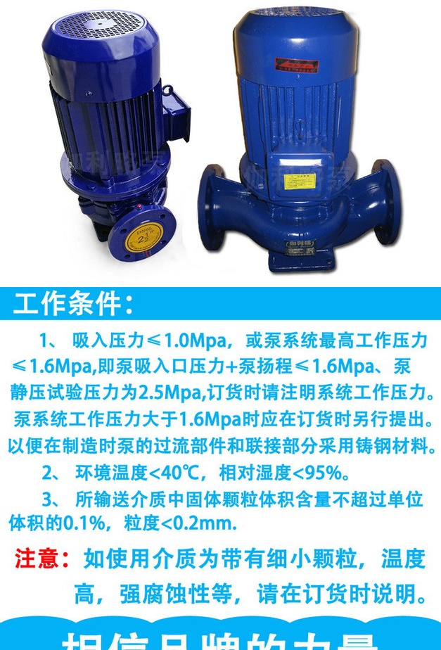 1、 吸入压力≤1.0Mpa,或泵系统高工作压力≤1.6Mpa,即泵吸入口压力+泵扬程≤1.6Mpa、泵静压试验压力为2.5Mpa,订货时请注明系统工作压力。泵系统工作压力大于1.6Mpa时应在订货时另行提出。以便在制造时泵的过流部件和联接部分采用铸钢材料。 2、 环境温度<40℃,相对湿度<95%。 3、 所输送介质中固体颗粒体积含量不超过单位体积的0.1%,粒度<0.2mm.注:如使用介质为带有细小颗粒,请在订货时说明,以便采用耐磨式机械密封。