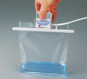 - 只需握住手钳打开钳口并夹住袋口后按下按钮,即可轻松封口。