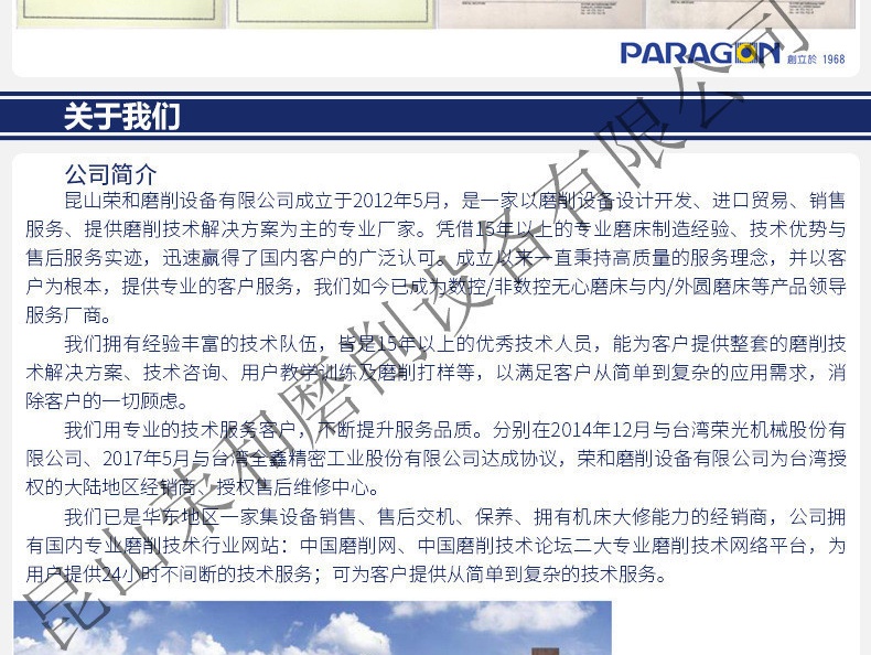 公司简介 昆山荣和磨削设备有限公司和昆山天石机械有限公司为台湾授权的大陆地区代理商、授权售后维修中心。