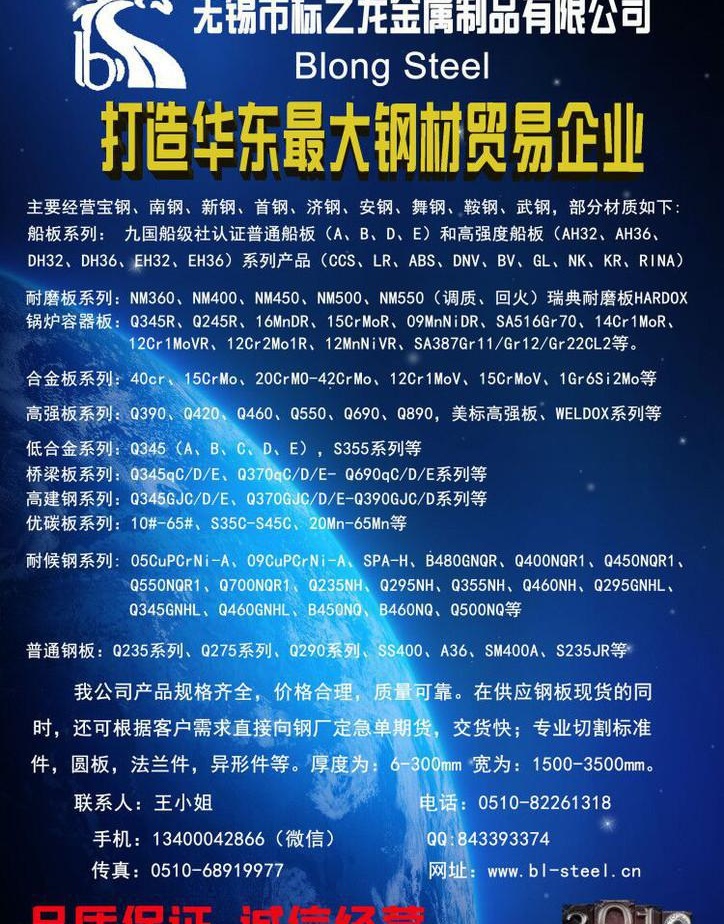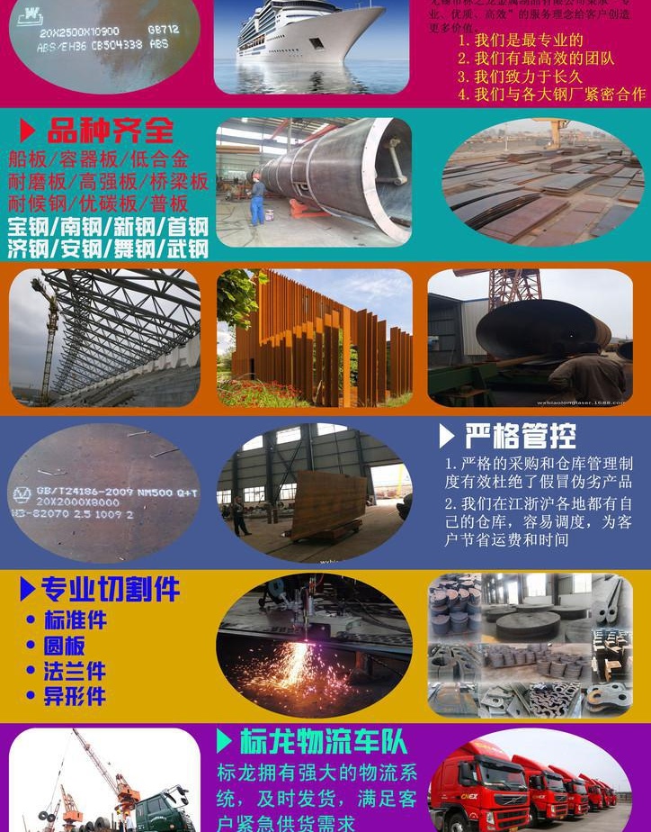 无锡市标之龙金属制品有限公司专业切割钢板 ,可切割成件,圆板,法兰件,异形件等。可向钢厂代订期货,可接急单期货,交货快,价格优。专业销售钢板,库存充足,价格优惠,可安排物流送到。船板系列: 九国船级社认证普通船板(A、B、D、E)和度船板(AH32、AH36、DH32、DH36、EH32、EH36)系列CCS、LR、ABS、DNV、BV、GL、NK、KR、RINA产品。耐磨板系列:NM360、NM400、NM450、NM500、NM550瑞典耐磨板系列等。容器板系列:Q345R、Q245R、16MnDR、15CrMoR、09MnNiDR、SA516Gr70、14Cr1MoR、12Cr1MoVR、SA387Gr11CL2 、SA387Gr12CL2、SA387Gr22CL2等。 合金钢系列:40cr、15CrMo、20CrMO-42CrMo、12Cr1MoV、15CrMoV、1Gr6Si2Mo等。板系列:Q390、Q420、Q460、Q550、Q690、Q890。美标板、WELDOX系列等。低合金系列:Q345A、Q345B、Q345C、 Q345D、 Q345E、S355系列等。桥梁板系列:Q345qC、Q345qD、Q345qE、Q370qCDE- Q690CDE系列等。高建钢系列:Q345GJC、Q345GJD、Q345GJE、Q370GJCDE-Q390GJCD系列等。优碳板系列:10#-65#、S35C-S45C、20Mn-65Mn等。耐候钢系列:05CuPCrNi-A,09CuPCrNi-A,SPA-H,B480GNQR,Q400NQR1,Q450NQR1,Q550NQR1,Q700NQR1,Q235NH,Q295NH,Q355NH,Q460NH,Q295GNHL,Q345GNHL,Q460GNHL, B450NQ,B460NQ,Q500NQ等。普通钢板:Q235系列、Q275系列、Q290系列、SS400、A36、400A、S235JR等。联系人:王梦娇 电话:0510-82261318 手机:13400042866 (微信) QQ:2690371178 传真:0510-80238501