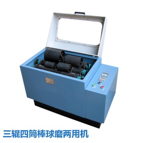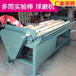 两种不同规格的磨矿滚筒按使用需要可以单独或同时放在主机上三层平行排列在橡胶辊上,主动电动机经两级三角皮带减速,使中间轴上主动辊有两级不同转速,以适应各种磨矿的要求。磨矿滚筒放在胶辊上因受摩擦力的作用在主、从胶辊上滚动,使滚筒中磨矿介质在筒壁内产生冲击、磨剥的作用而进行磨矿。磨筒在磨矿同时具有自行混匀功能。