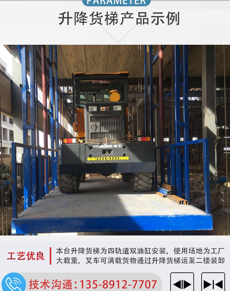 汇泽机械悍力SJD 液压货梯 液压升降货梯升降机 载货升降货梯加工定制 上门安装 。 液压货梯 (上下层安全运输的设备) 有七项安全措施的货梯,是一种通过人工操作,使货物升降货梯起重升降,完成上下层安全运输的设备。升降货梯根据类型可分为:剪叉式升降货梯和导轨式升降货梯。升降货梯的起升高度从1米至20米不等,并可根据用户要求定做特殊规格的升降货梯。主要用于工厂流水线、货物仓库、停车场、码头、建筑、物流等的高空货物上下运输。升降货梯升降系统,是靠液压泵站驱动,故也被称作液压升降货梯。 【1】液压货梯简介 液压载货货梯是一种起重升降机械设备,升降货梯升降系统,靠液压泵站驱动,故也被称作液压升降货梯。升降货梯用于建筑物层高间运送货物的,专用液压升降货梯产品,主要用各种工作层间货物上下运送;立体车库和地下车库层高间汽车举升等。产品液压系统设置防坠、超载安全保护装置,各楼层和升降台工作台面均可设置操作按钮,实现多点控制。产品结构坚固,承载量大,升降平稳,安装维护简单方便,是经济实用的低楼层间替代电梯的理想货物输送设备。 【2】货梯分类 升降货梯根据类型可分为:剪叉式升降货梯和导轨式升降货梯。升降货梯的起升高度从1米至30米不等,并可根据用户要求定做特殊规格的升降货梯。 【3】载货升降机功能 升降货梯最大承载30吨,实现多点控制,上下楼层互动联锁,达到安全使用;提升高度高,采用旁置油缸、或双测式油缸,运行平稳、无噪声、维修方便、使用寿命较长;停电手动下降、紧急停止按钮,方便、快捷、实用;地坑深度一般为15cm-30cm,顶层高度不受限制,可根据现场环境定做用;层门可贯通,厂房内外可相互戳开,方便、节省空间;特别适合2-3层钢结构厂房,内外部均可使用;泵站采用进口泵站,如果速度要求过高,采用进口定制泵站,达到理想的送货要求,油缸和密封件采用进口零部件,解决客户油压不稳定,零部件漏油问题,电器零部件可选(上海人民电器、法国施耐德、德国西门子)。 【4】升降货梯安全性能 升降货梯在具备传统曳引式电梯的安全装置的同时, 还设有:溢流阀:可防止上行运动时系统压力过高,应急手动阀:电源发生故障时, 可使轿厢应急下降到安全的层楼位置开门, 手动泵:当系统发生故障时, 可操纵手动泵打出高压油使轿厢上升到安全的层楼位置; 管路破裂阀:当液压系统管路破裂轿厢失速下降时, 可自动切断油路停止下降。油箱油温保护:当油箱中油温超过标准设定值时, 油温保护装置发生信号, 暂停电梯使用, 当油温下降后方可启动电梯。 【5】货梯用途 不能到达要求的场合等比较难解决的狭小空间,可以量身打造高效率的送货平台。升降货梯产品液压系统设置防坠、上下层门互动连锁,各楼层和升降台工作台面均可设置操作按钮,实现多点控制。根据升降台的安装环境和使用要求,选择不同的可选配置,可取得更好的使用效果,本产品主要应用于化工、高温、高压、电厂等企业。