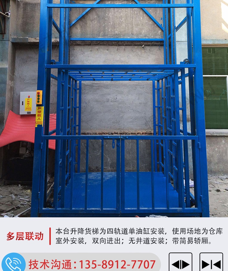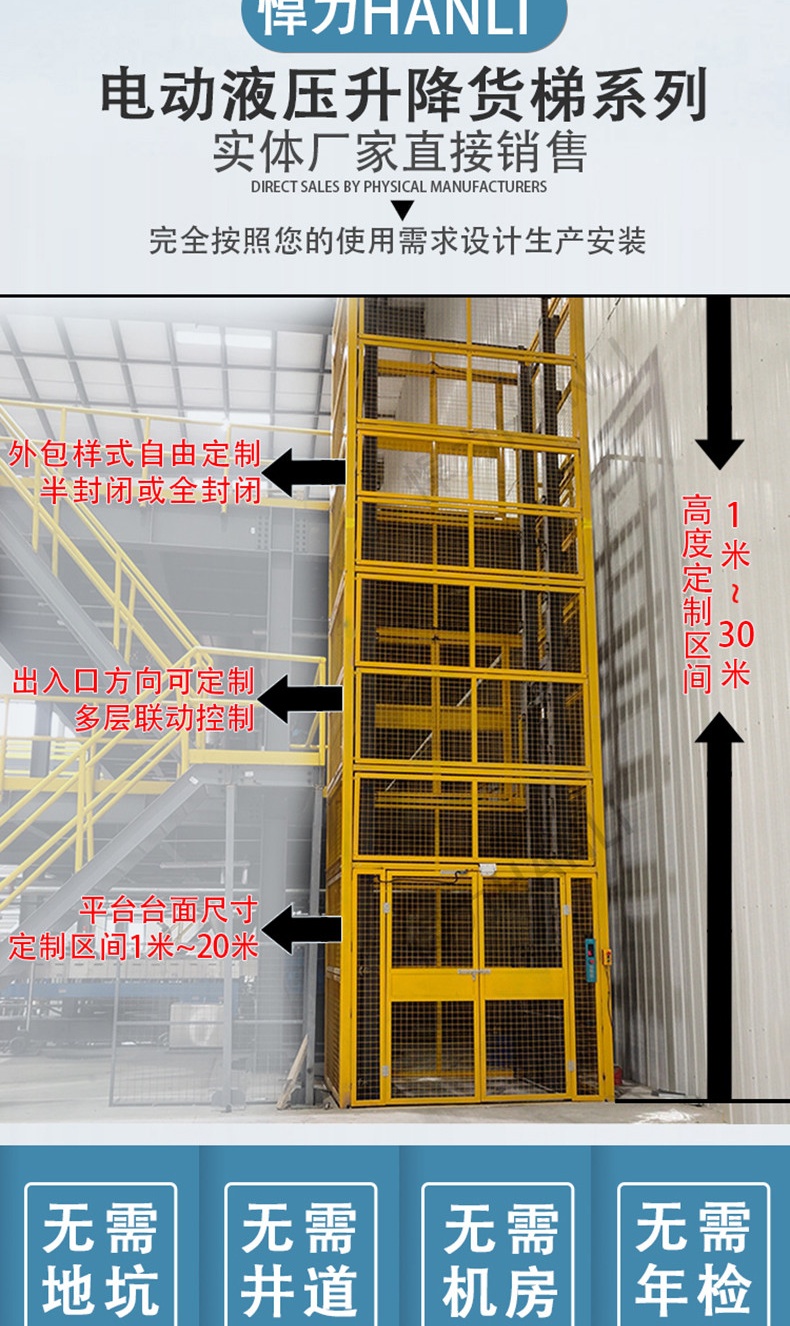 汇泽机械悍力SJD 液压货梯 液压升降货梯升降机 载货升降货梯加工定制 上门安装 。 液压货梯 (上下层安全运输的设备) 有七项安全措施的货梯,是一种通过人工操作,使货物升降货梯起重升降,完成上下层安全运输的设备。升降货梯根据类型可分为:剪叉式升降货梯和导轨式升降货梯。升降货梯的起升高度从1米至20米不等,并可根据用户要求定做特殊规格的升降货梯。主要用于工厂流水线、货物仓库、停车场、码头、建筑、物流等的高空货物上下运输。升降货梯升降系统,是靠液压泵站驱动,故也被称作液压升降货梯。 【1】液压货梯简介 液压载货货梯是一种起重升降机械设备,升降货梯升降系统,靠液压泵站驱动,故也被称作液压升降货梯。升降货梯用于建筑物层高间运送货物的,专用液压升降货梯产品,主要用各种工作层间货物上下运送;立体车库和地下车库层高间汽车举升等。产品液压系统设置防坠、超载安全保护装置,各楼层和升降台工作台面均可设置操作按钮,实现多点控制。产品结构坚固,承载量大,升降平稳,安装维护简单方便,是经济实用的低楼层间替代电梯的理想货物输送设备。 【2】货梯分类 升降货梯根据类型可分为:剪叉式升降货梯和导轨式升降货梯。升降货梯的起升高度从1米至30米不等,并可根据用户要求定做特殊规格的升降货梯。 【3】载货升降机功能 升降货梯最大承载30吨,实现多点控制,上下楼层互动联锁,达到安全使用;提升高度高,采用旁置油缸、或双测式油缸,运行平稳、无噪声、维修方便、使用寿命较长;停电手动下降、紧急停止按钮,方便、快捷、实用;地坑深度一般为15cm-30cm,顶层高度不受限制,可根据现场环境定做用;层门可贯通,厂房内外可相互戳开,方便、节省空间;特别适合2-3层钢结构厂房,内外部均可使用;泵站采用进口泵站,如果速度要求过高,采用进口定制泵站,达到理想的送货要求,油缸和密封件采用进口零部件,解决客户油压不稳定,零部件漏油问题,电器零部件可选(上海人民电器、法国施耐德、德国西门子)。 【4】升降货梯安全性能 升降货梯在具备传统曳引式电梯的安全装置的同时, 还设有:溢流阀:可防止上行运动时系统压力过高,应急手动阀:电源发生故障时, 可使轿厢应急下降到安全的层楼位置开门, 手动泵:当系统发生故障时, 可操纵手动泵打出高压油使轿厢上升到安全的层楼位置; 管路破裂阀:当液压系统管路破裂轿厢失速下降时, 可自动切断油路停止下降。油箱油温保护:当油箱中油温超过标准设定值时, 油温保护装置发生信号, 暂停电梯使用, 当油温下降后方可启动电梯。 【5】货梯用途 不能到达要求的场合等比较难解决的狭小空间,可以量身打造高效率的送货平台。升降货梯产品液压系统设置防坠、上下层门互动连锁,各楼层和升降台工作台面均可设置操作按钮,实现多点控制。根据升降台的安装环境和使用要求,选择不同的可选配置,可取得更好的使用效果,本产品主要应用于化工、高温、高压、电厂等企业。