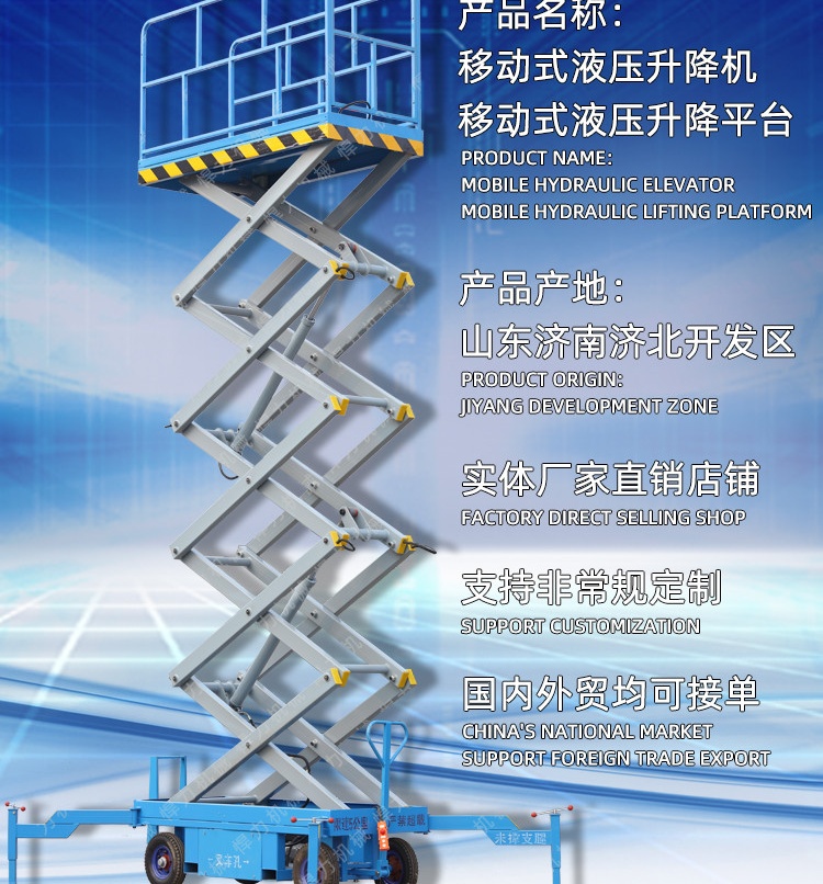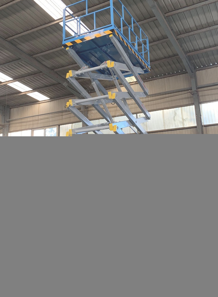 移动式升降机升降平台产品介绍:常规移动式升降平台分为:4米移动式升降平台,6米移动式升降平台,7米移动式升降平台,8米移动式升降平台,9米移动式升降平台,10米移动式升降平台,12米移动式升降平台,14米移动式升降平台,16米移动式升降平台,18米移动式升降平台,其它规格可以根据情况进行定制。移动式升降平台系列为人工移动式和电动助力式,平台升降动力为二相或三相电源;控制,有手动控制和电动控制,另备有手压泵,供停电时使用,该系列平台移动灵活、升降平稳、操作方便等特点,适用于高空作业现场频繁变更的场所,如:建筑工地、工厂、机关、商店、车间、宾馆、机场、码头、装饰、博物馆、会议中心、加油站、体育场馆、高架管道等以及各类设备维护、现场电力设施维护和钢架结构维护等 。