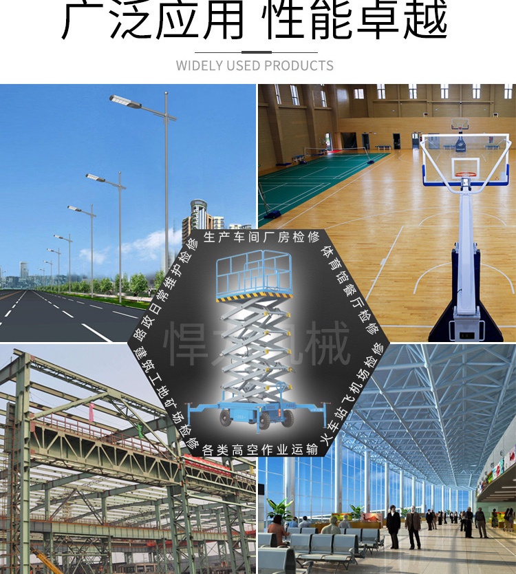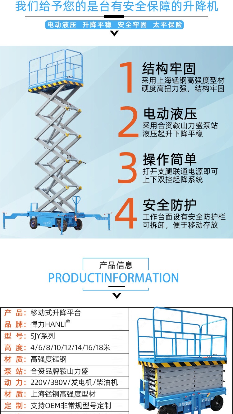 移动式升降机升降平台产品介绍:常规移动式升降平台分为:4米移动式升降平台,6米移动式升降平台,7米移动式升降平台,8米移动式升降平台,9米移动式升降平台,10米移动式升降平台,12米移动式升降平台,14米移动式升降平台,16米移动式升降平台,18米移动式升降平台,其它规格可以根据情况进行定制。移动式升降平台系列为人工移动式和电动助力式,平台升降动力为二相或三相电源;控制,有手动控制和电动控制,另备有手压泵,供停电时使用,该系列平台移动灵活、升降平稳、操作方便等特点,适用于高空作业现场频繁变更的场所,如:建筑工地、工厂、机关、商店、车间、宾馆、机场、码头、装饰、博物馆、会议中心、加油站、体育场馆、高架管道等以及各类设备维护、现场电力设施维护和钢架结构维护等 。