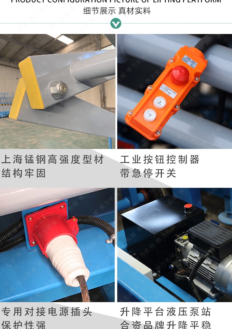 移动式升降机升降平台产品介绍:常规移动式升降平台分为:4米移动式升降平台,6米移动式升降平台,7米移动式升降平台,8米移动式升降平台,9米移动式升降平台,10米移动式升降平台,12米移动式升降平台,14米移动式升降平台,16米移动式升降平台,18米移动式升降平台,其它规格可以根据情况进行定制。移动式升降平台系列为人工移动式和电动助力式,平台升降动力为二相或三相电源;控制,有手动控制和电动控制,另备有手压泵,供停电时使用,该系列平台移动灵活、升降平稳、操作方便等特点,适用于高空作业现场频繁变更的场所,如:建筑工地、工厂、机关、商店、车间、宾馆、机场、码头、装饰、博物馆、会议中心、加油站、体育场馆、高架管道等以及各类设备维护、现场电力设施维护和钢架结构维护等 。