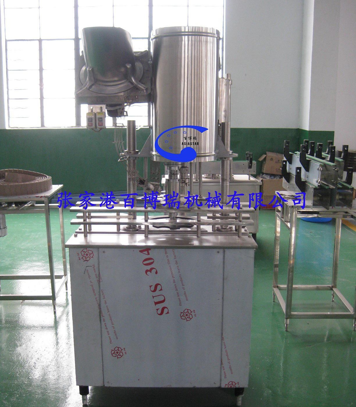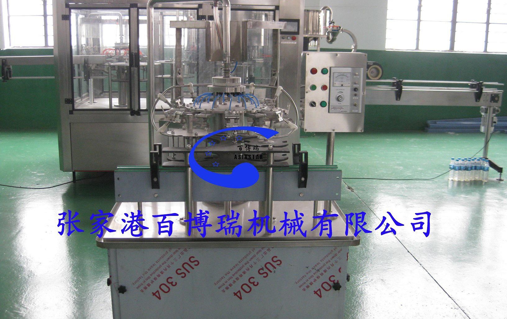 3、采用全程不锈钢瓶夹传送瓶子的方式。主机采用风送道与进瓶拨轮直连技术,同时瓶子传输全部采用卡瓶颈技术,这样在PET瓶口径不变的前提下更换瓶形,无需更换任何变更件,节省了不同瓶型转化的调整时间。